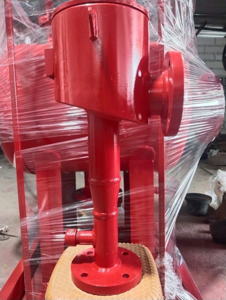 Foam Chamber Square type (round type) is made of schedule 40 black pipe. On the inlet side there is an orifice made of bronze and then at the top there is a foam chamber which is installed with a seal gasket and a glass plate to prevent steam from outside evaporating from entering and will break when the system starts working so that the foam that is formed enters the tank touching the deflector in the tank so that the foam can spread evenly.